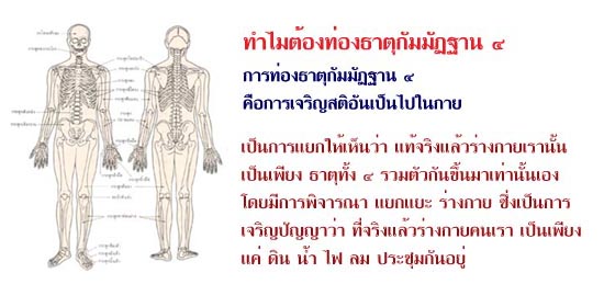 ความกำหนดพิจารณากายนี้ให้เห็นว่าเป็นแต่เพียงธาตุ๔ คือ ดิน น้ำ ไฟ ลมประชุมกันอยู่ ไม่ใช่เราไม่ใช่ของเรา เรียกว่า ธาตุกัมมัฏฐาน ๔